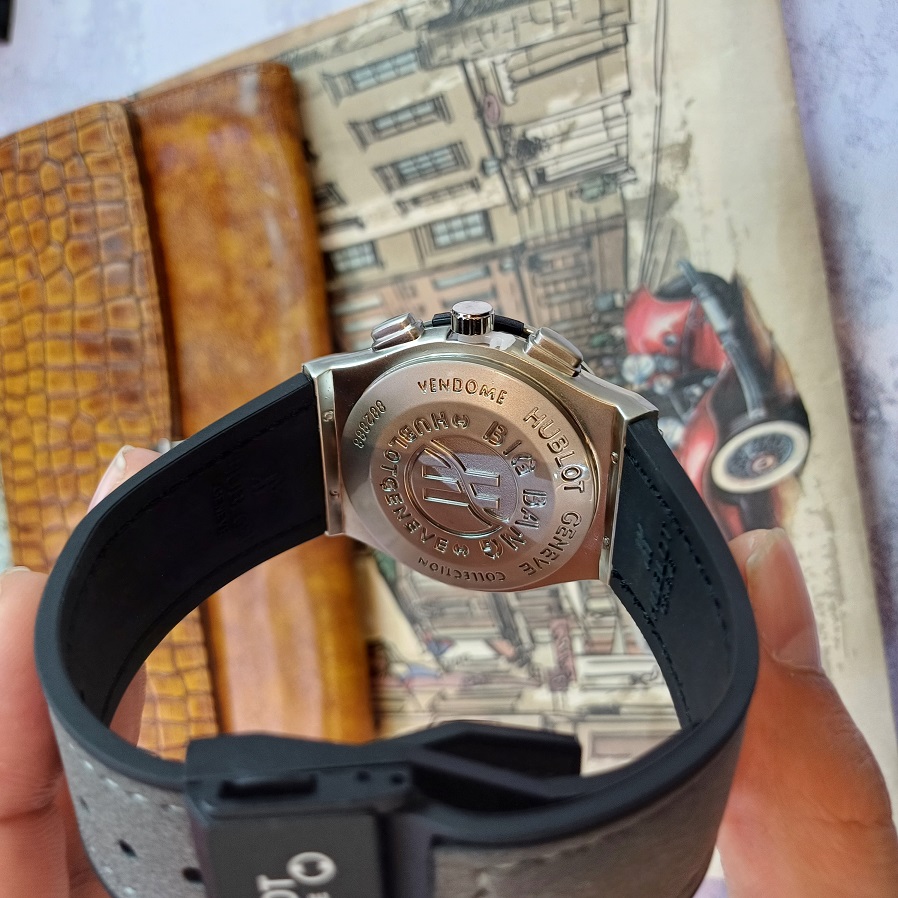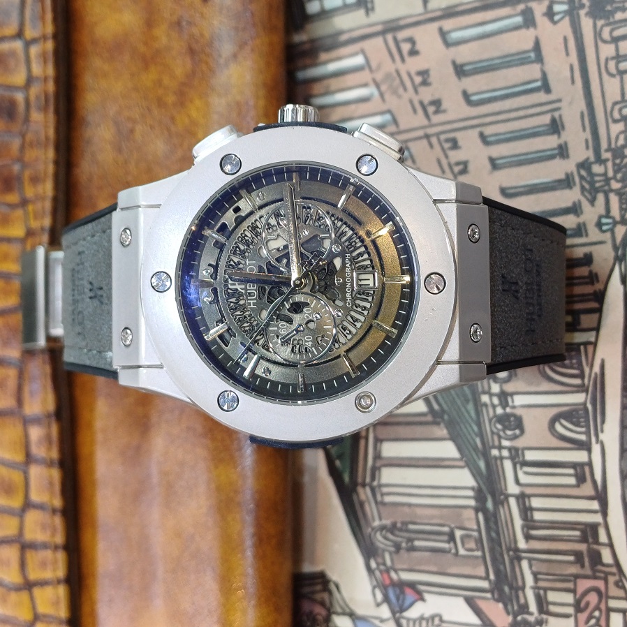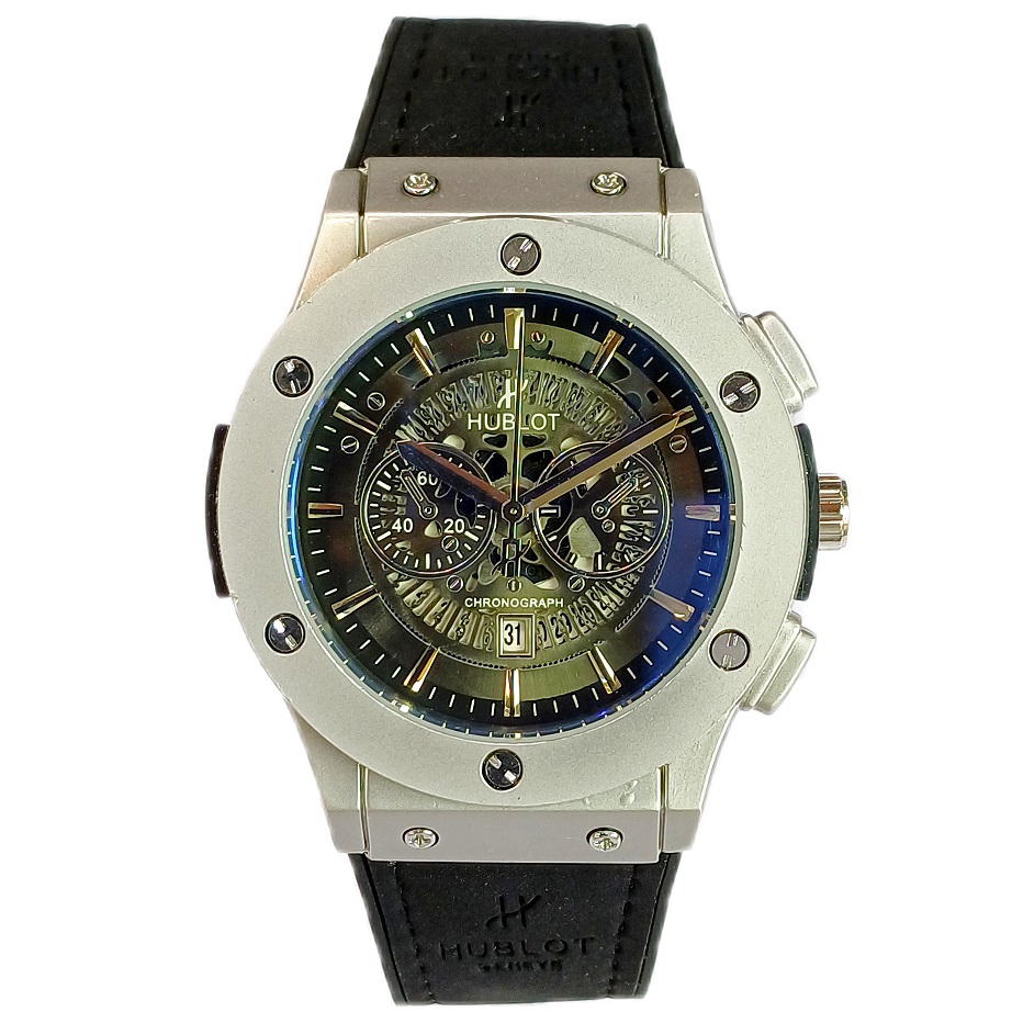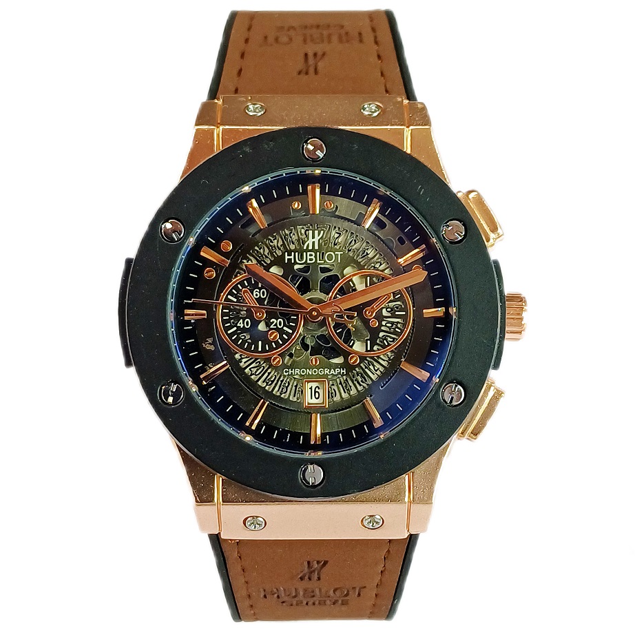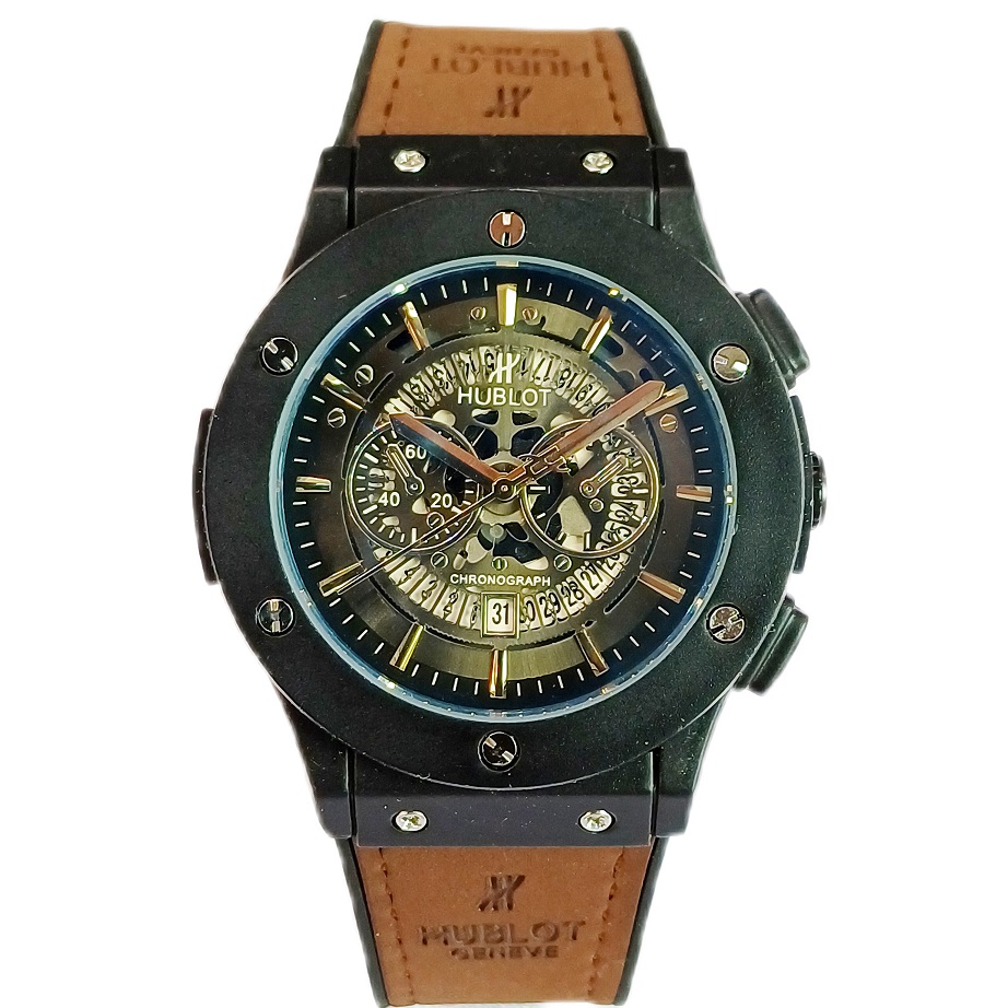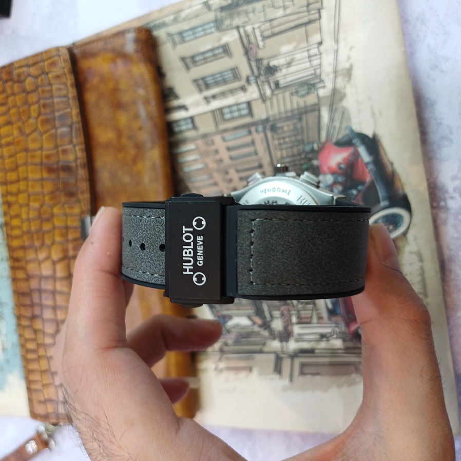 ساعت مچی عقربه ای آنالوگ برند HUBLOT تک موتور تاریخ شمار دار بند چرم قفل فیکسر پروانه ای
