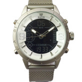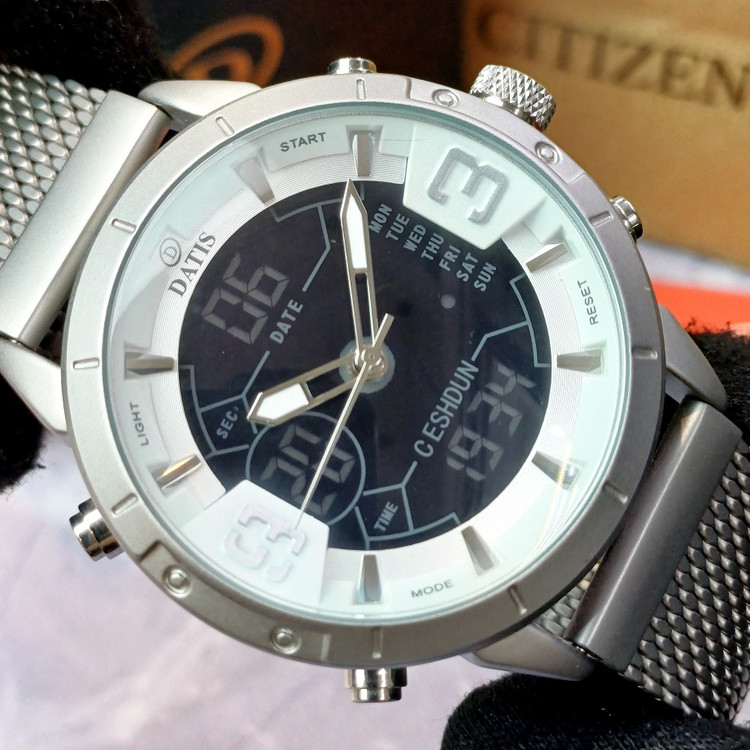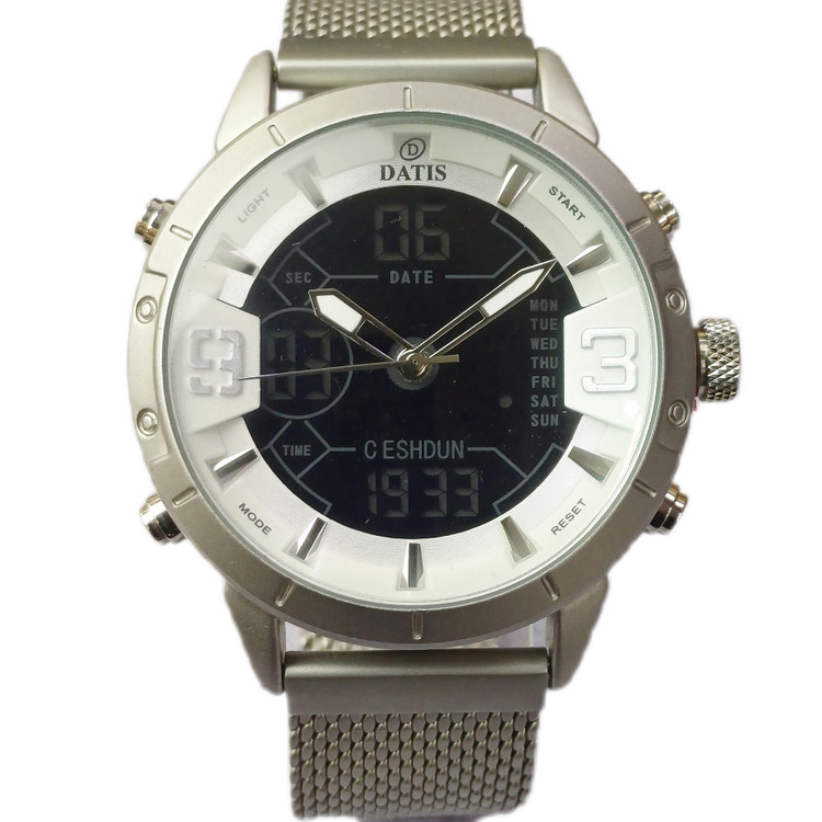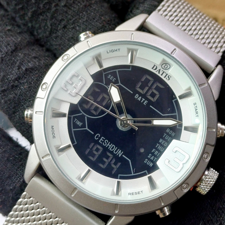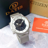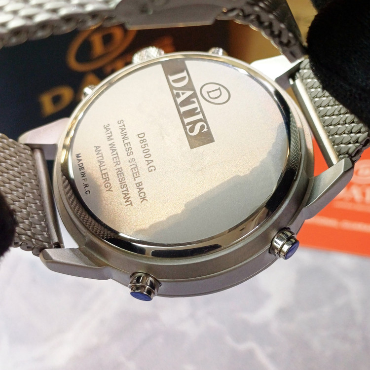 ساعت عقربه ای آنالوگ برند داتیس DATIS موتور میوتای ژاپن دوزمانه فعال بند میلانس استیل 316Lرنگ ثابت به همراه گارانتی کارت دوساله موتور