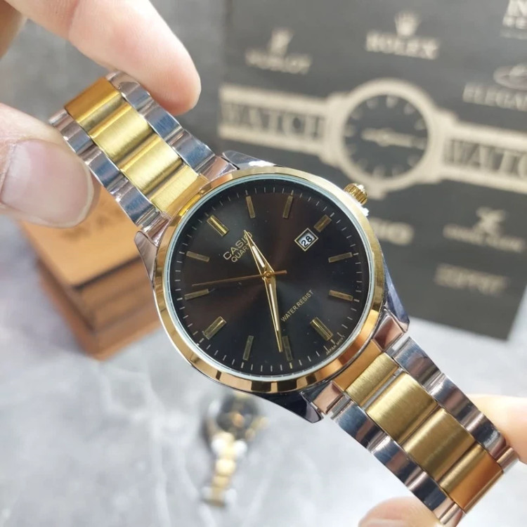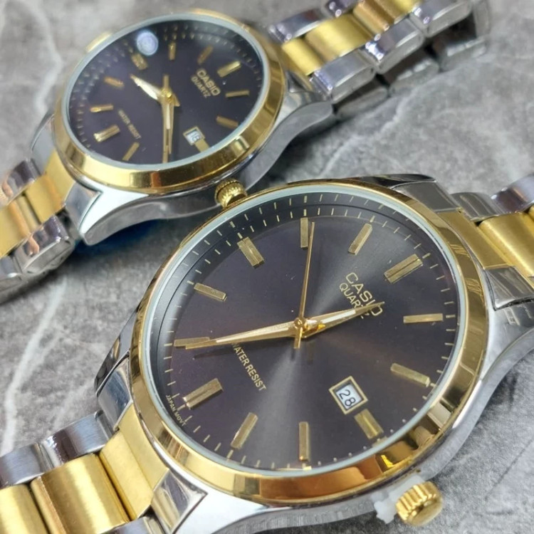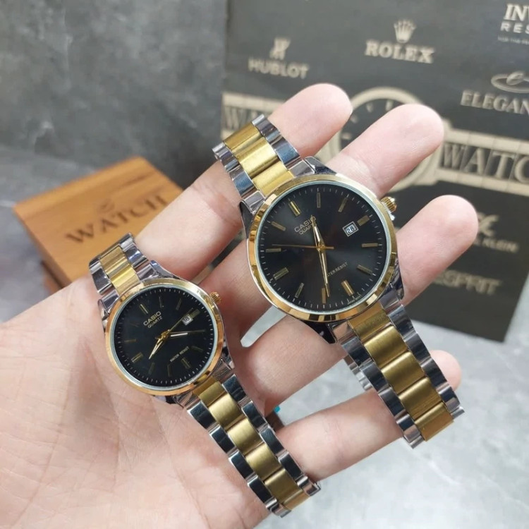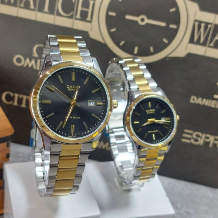 ست ساعت زنانه و مردانه برند کاسیو با طراحی کلاسیک و ترکیب رنگ نقرهای–طلایی، انتخابی شیک و ماندگار برای زوجهاییست که به ظرافت و هماهنگی اهمیت میدهند. این مدل با صفحه مشکی و بند استیل، هم در استایل رسمی و هم روزمره قابل استفاده است. 💞