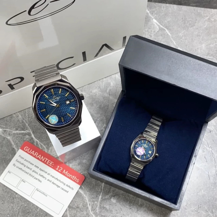ست ساعت مچی زنانه و مردانه Elegance Special با صفحهی آبی طرحدار، نشانگر تاریخ و بند فلزی مقاوم؛ انتخابی خاص و شیک برای زوجهای خوشسلیقه، مناسب هدیه عاشقانه و استفادهی روزمره با جلوهی لوکس و ماندگار. 🤩