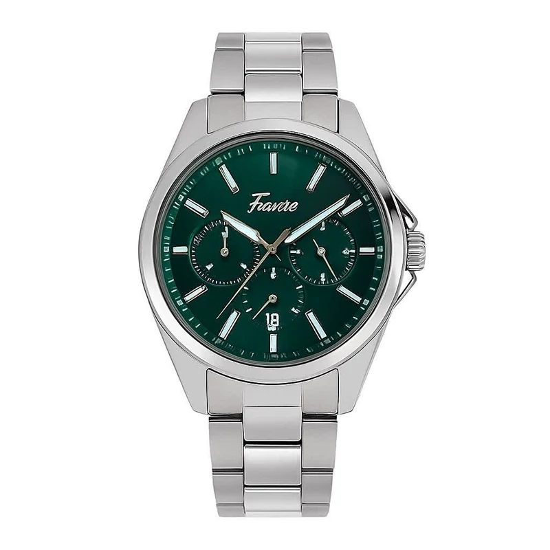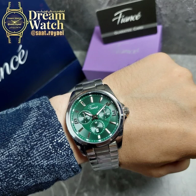 ساعت مچی مردانه Fiancé با صفحهی سبز کرنوگراف و بند فلزی نقرهای، انتخابی خاص و لوکس برای آقایانی که به دقت، طراحی مدرن و اصالت برند اهمیت میدهند.💚😎