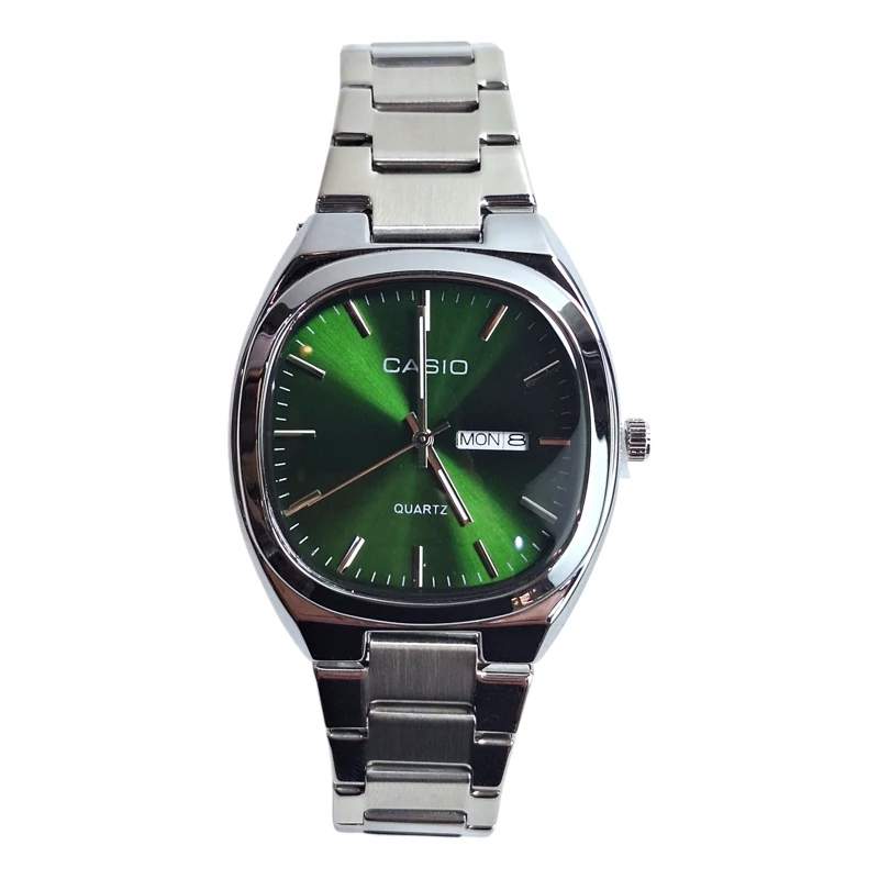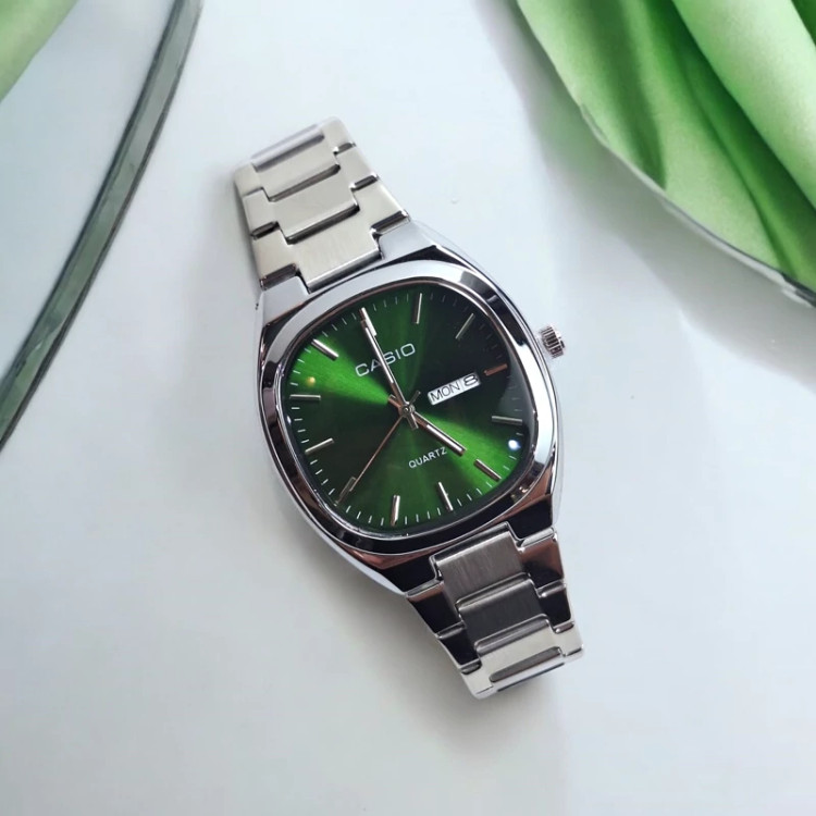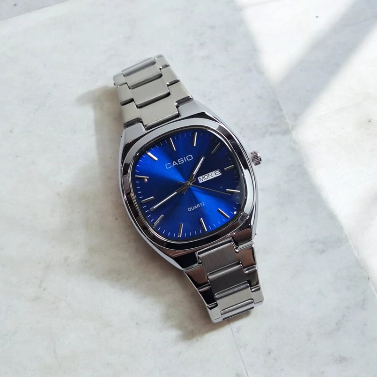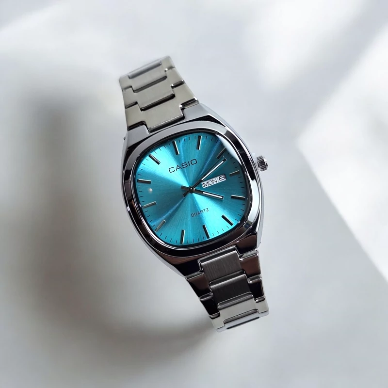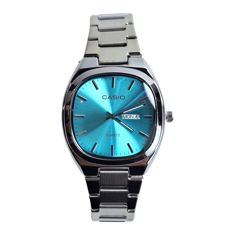 🔶ساعت کاسیو مردانه دارای تقویم روز شمار ایام هفته رنگ بدنه نقره ای رنگ صفحه: آبی تیفانی،آبی کاربنی، سبز، سفید جنس قاب:alloy جنس بند :استیل شیشه معمولی اندازه صفحه :25میلیمتر ضداب :درحد شست و شو بند در حالت باز :16cm قطر بند :1/5 cm قطر ساعت : 0/08 cm منبع انرژی :کوارتز موجودی آبی تیفانی(کمرنگ) :4عدد سبز:3عدد سفید :1عدد آبی کاربنی (پررنگ) :2عدد