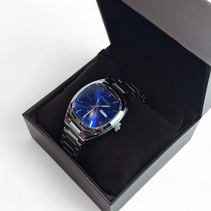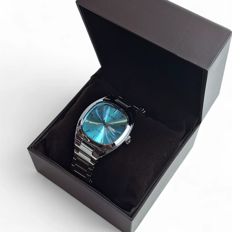 🔶ساعت کاسیو مردانه دارای تقویم روز شمار ایام هفته رنگ بدنه نقره ای رنگ صفحه: آبی تیفانی،آبی کاربنی، سبز، سفید جنس قاب:alloy جنس بند :استیل شیشه معمولی اندازه صفحه :25میلیمتر ضداب :درحد شست و شو بند در حالت باز :16cm قطر بند :1/5 cm قطر ساعت : 0/08 cm منبع انرژی :کوارتز موجودی آبی تیفانی(کمرنگ) :4عدد سبز:3عدد سفید :1عدد آبی کاربنی (پررنگ) :2عدد