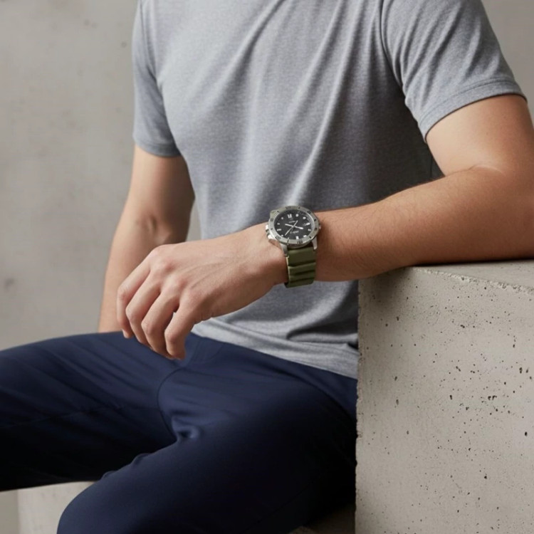 ویژگی ها مناسب برای : آقایان مقاومت در برابر آب تا : 50 متر منبع انرژی : باتری معمولی فرم قاب : گرد جنس قاب : استیل ضدزنگ رنگ بدنه : نقره ای جنس بند : رزین نوع قفل : سگکی ساده گارانتی : 12 ماه پوزیترون مشخصات اولیه وزن : 79 مناسب برای : آقایان نوع ساعت : آنالوگ اندازه ساعت : 49 × 45 × 10.3 عرض (میلیمتر) : 45 ضخامت (میلیمتر) : 10.3 مقاومت در برابر آب تا : 50 متر منبع انرژی : باتری معمولی مشخصات ظاهری فرم قاب : گرد جنس بدنه : استیل ضدزنگ جنس قاب : استیل ضدزنگ رنگ بدنه : نقره ای رنگ صفحه : مشکی / دودی تیره رنگ قاب : نقرهای جنس شیشه : معدنی جنس بند : رزین رنگ بند : سبز اندازه بند : بند با قفل قابل تنظیم بین 145 تا 215 میلیمتر نوع قفل : سگکی ساده مشخصات عملکردی تقویم : نمایش تاریخ دقت ساعت : ±20 ثانیه در ماه